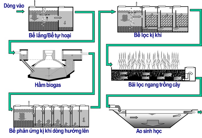 - Xử lý hiếu khí bậc 3: Thông qua bãi lọc ngang (với vật liệu là sỏi, đá dăm…) có trồng cây (lau sậy, dong riềng…)/ hoặc hệ thống ao hiếu khí.